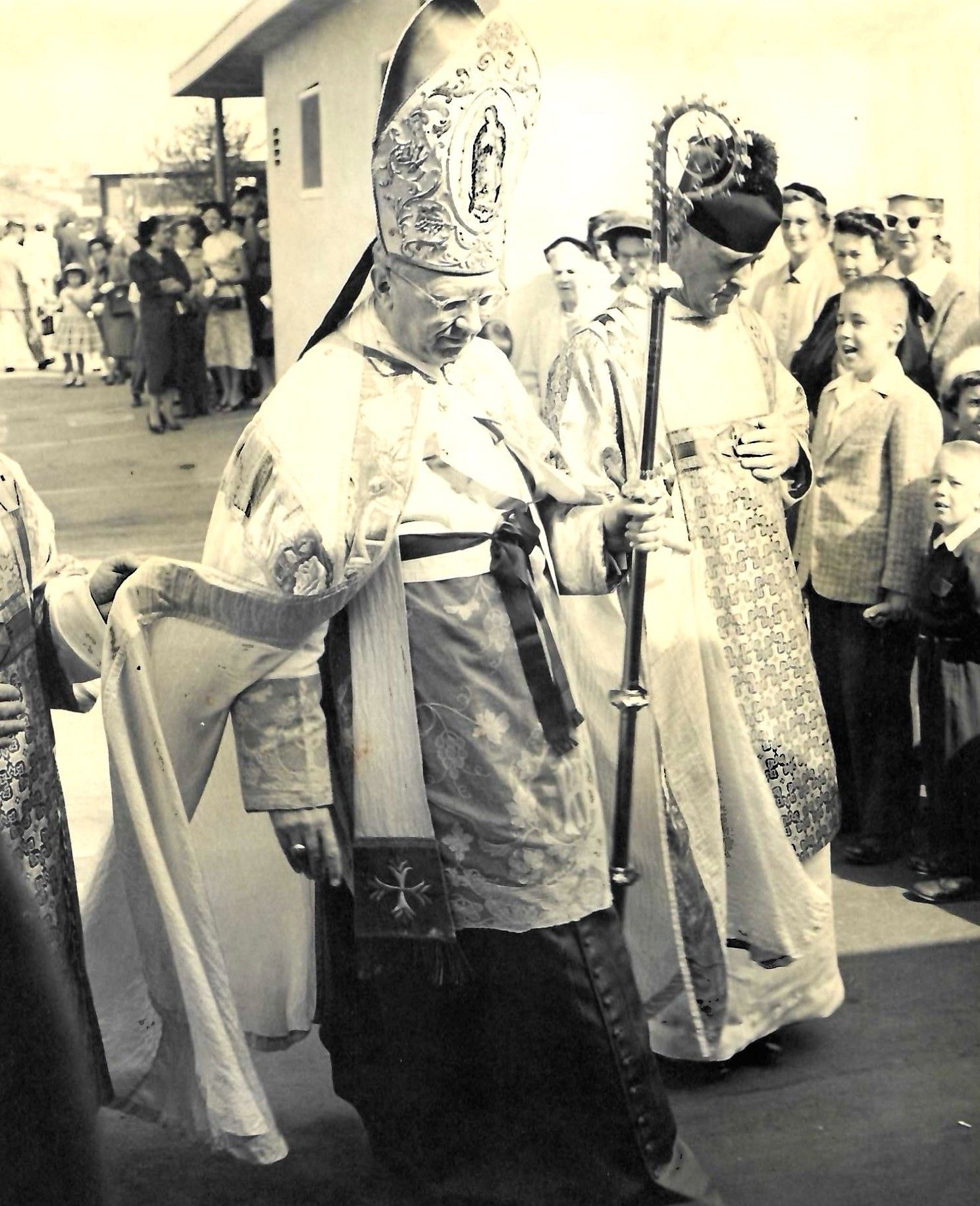 ln November 1952 the Assistant Pastor of St. Alphonsus Church in Los Angeles, Rev. James P. Diamond, was called to the office of the Archbishop of Los Angeles, Cardinal McIntyre, and notified that he was to form a new parish in the Westchester area of Los Angeles and that he was to be its first Pastor. The new parish was to include the area bounded by Georgetown Avenue on the east, the Los Angeles city limits alongside Hughes Aircraft Company on the north, the Pacific Ocean on the west, and Killgore Street on the south. This new parish was to be created from part of Visitation Parish, which itself had been created less than a decade before in 1943 during the rapid growth of Los Angeles in World War II.