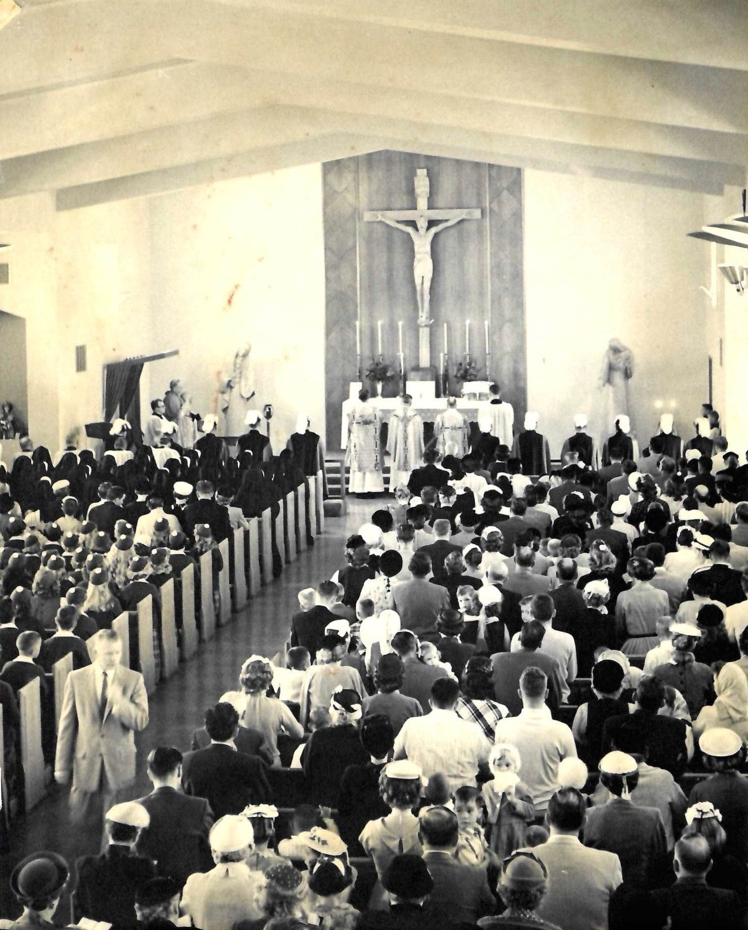 With the completion of the new church building on Manchester Avenue, the parishioners were back at work! The altar, the tabernacle, the large crucifix above the altar, the lectern and other items were made by the people of St. Anastasia. Originally designed for eventual conversion to an auditorium, the new church building seated 700. It saw its first Mass on Thanksgiving Day, November 26, 1953.