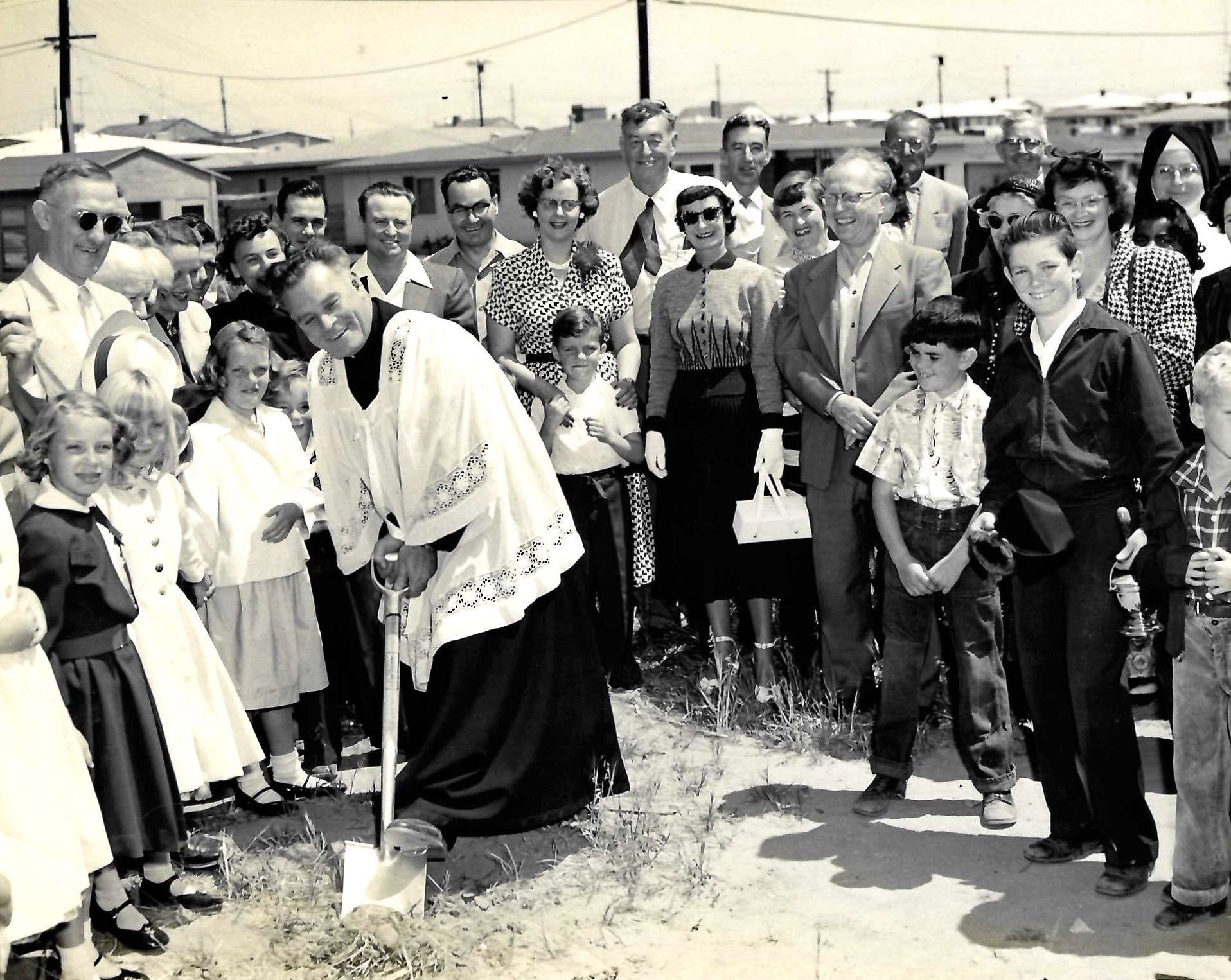 Construction of the new church began in early 1953 on property originally acquired by the Diocese for a new Catholic High School in the West L.A. area. Part of the property was reassigned for the new parish, and the rest traded for some nearby property where St. Bernard's High School would be built.